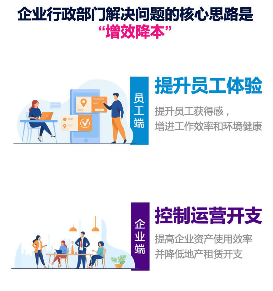 利用合理的软硬件工具,将办公空间策略贯彻到空间的运营管理当中,助力员工执行其各项任务,促进员工和团队更好的协作,从而提升员工体验和效率,最终增强组织生产能力的办公场所。
